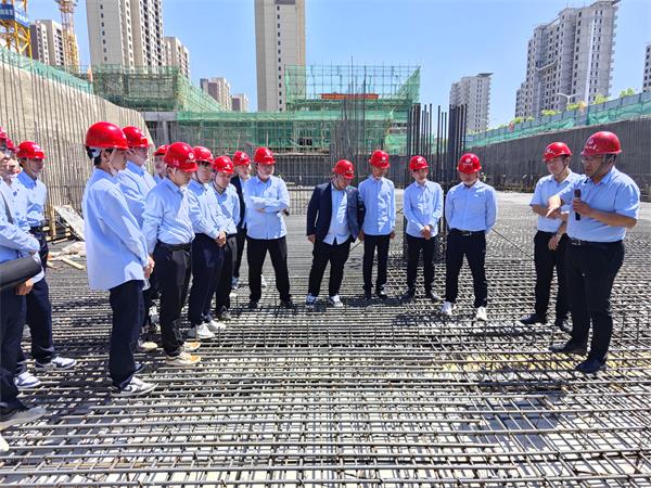 交流会结束后,28名青年职工在项目部主管工程师的带领下,观摩了地下车库止水钢板、实验楼黏滞阻尼器装置基础悬臂墙、免支模钢筋桁架楼承板等特殊关键过程施工工艺。观摩过程中,大家认真聆听讲解,不时提问,探讨各项技术问题,展现出浓厚的求知欲。